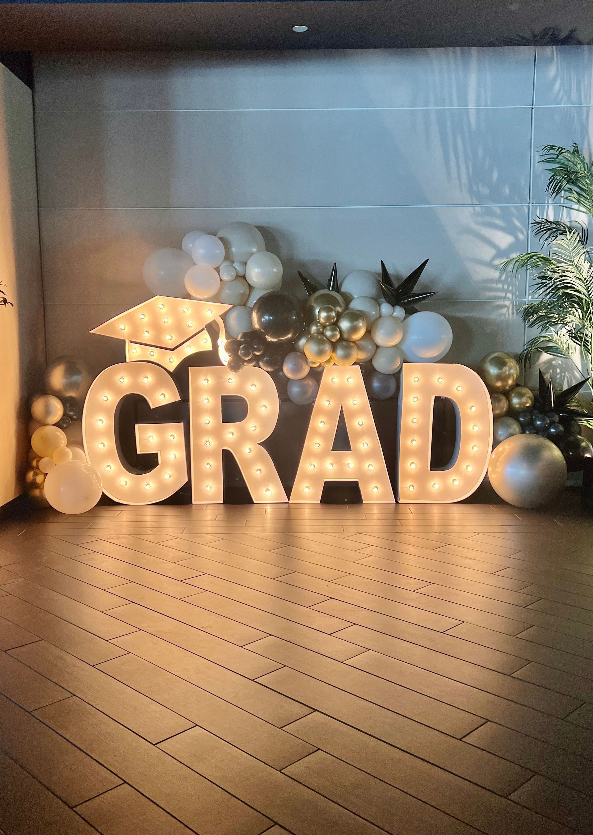 Celebrate your achievements i with custom balloons and backdrops in your school colors, highlighting your milestones and creating unforgettable memories at your graduation or class reunion. Don't forget the marquee!